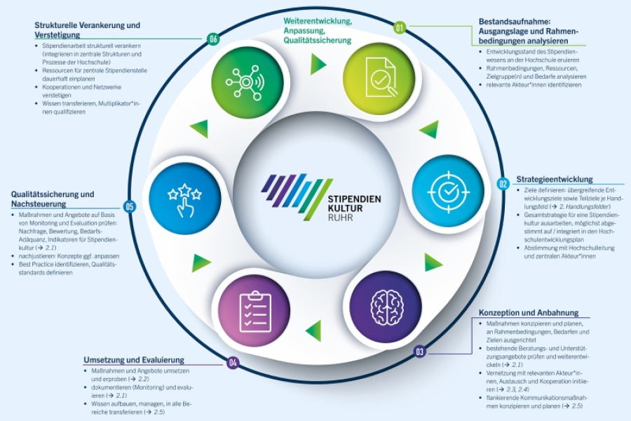 Der Wegweiser bietet einen Leitfaden für die Planung und Steuerung des Vorhabens, eine Stipendienkultur systematisch zu etablieren, weiterzuentwickeln und schließlich zu verankern.