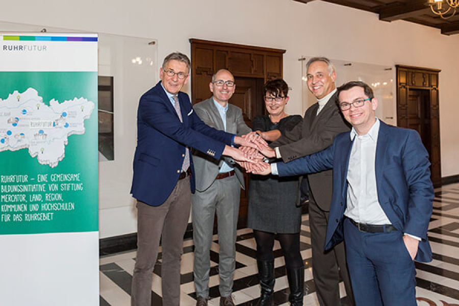 Prof. Dr. Jürgen Bock, Präsident der Hochschule Bochum, Dietmar Dieckmann, Beigeordneter für Bildung, Kultur und Sport der Stadt Bochum, Dr. Richard Schröder, Fachbereichsleiter Gesundheit, Bildung und Erziehung des Kreises Recklinghausen, sowie die RuhrFutur-Geschäftsführungen Ulrike Sommer und Dr. Oliver Döhrmann unterzeichneten am 31. Januar im Bochumer Rathaus die Kooperationsvereinbarung.